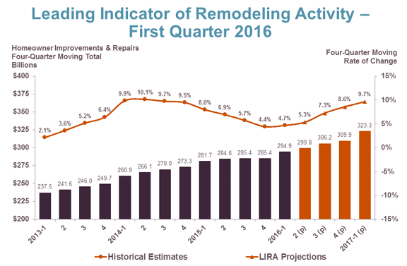 Note on the LIRA model: As of April 21, 2016, the LIRA has undergone a major re-benchmarking and recalculation in order to better forecast a broader segment of the national residential remodeling market. For more information on the implications of this change, see our earlier blog post, and read the research note:
