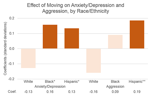 Compared to children who do not move to a new home, children who move are more likely to do worse in school, have more physical and mental health problems, and are more likely to be delinquent and use alcohol and drugs. In recent research that uses detailed data from the Project on Human Development in Chicago Neighborhoods, I find that African-American and Hispanic children showed more signs of anxiety and depression after they moved. I also find that, on average, Hispanic children demonstrated more aggressive behavior after they moved (Figure 1). White children in this sample, however, did not appear to be negatively affected by a move.