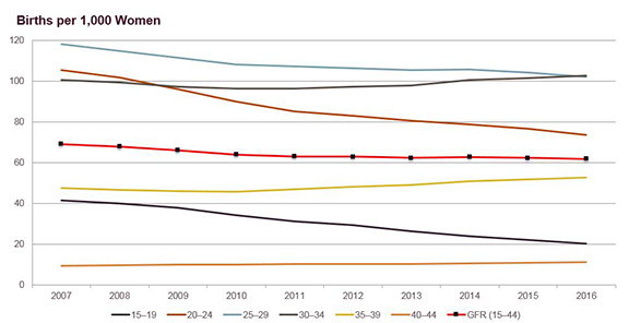 Note: Since births to women ate 45-49 are so few, they were excluded from this figure, which makes the GFR line an approximation of the General Fertility Rate.