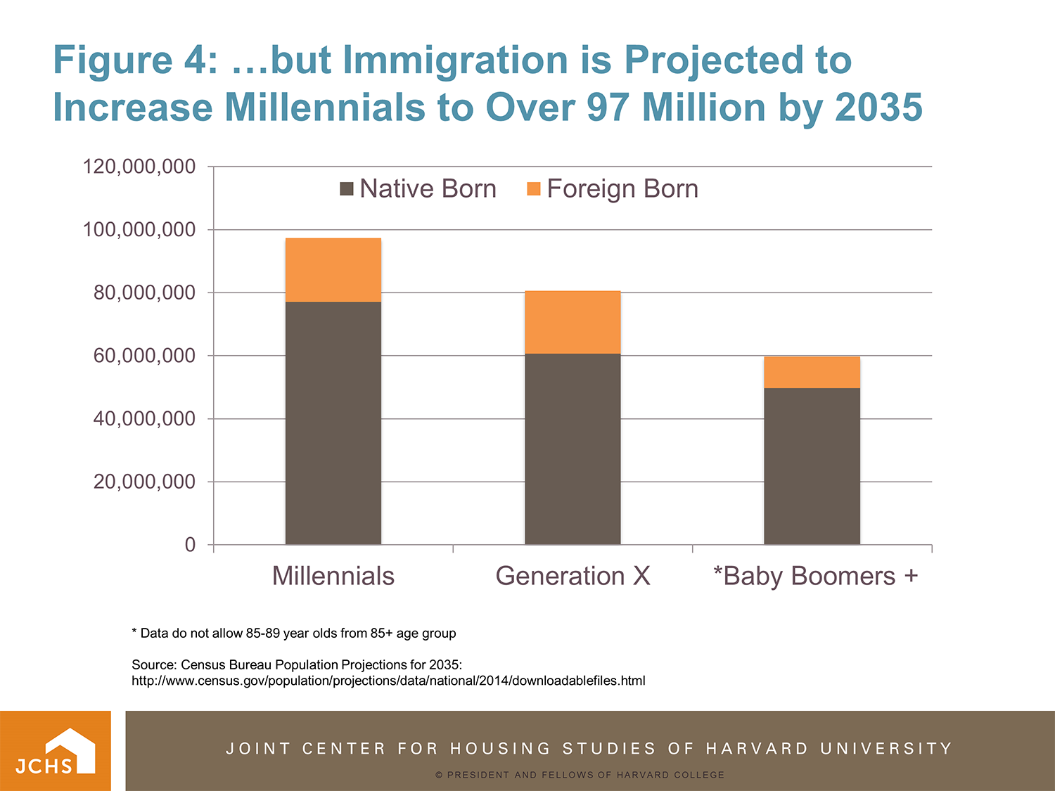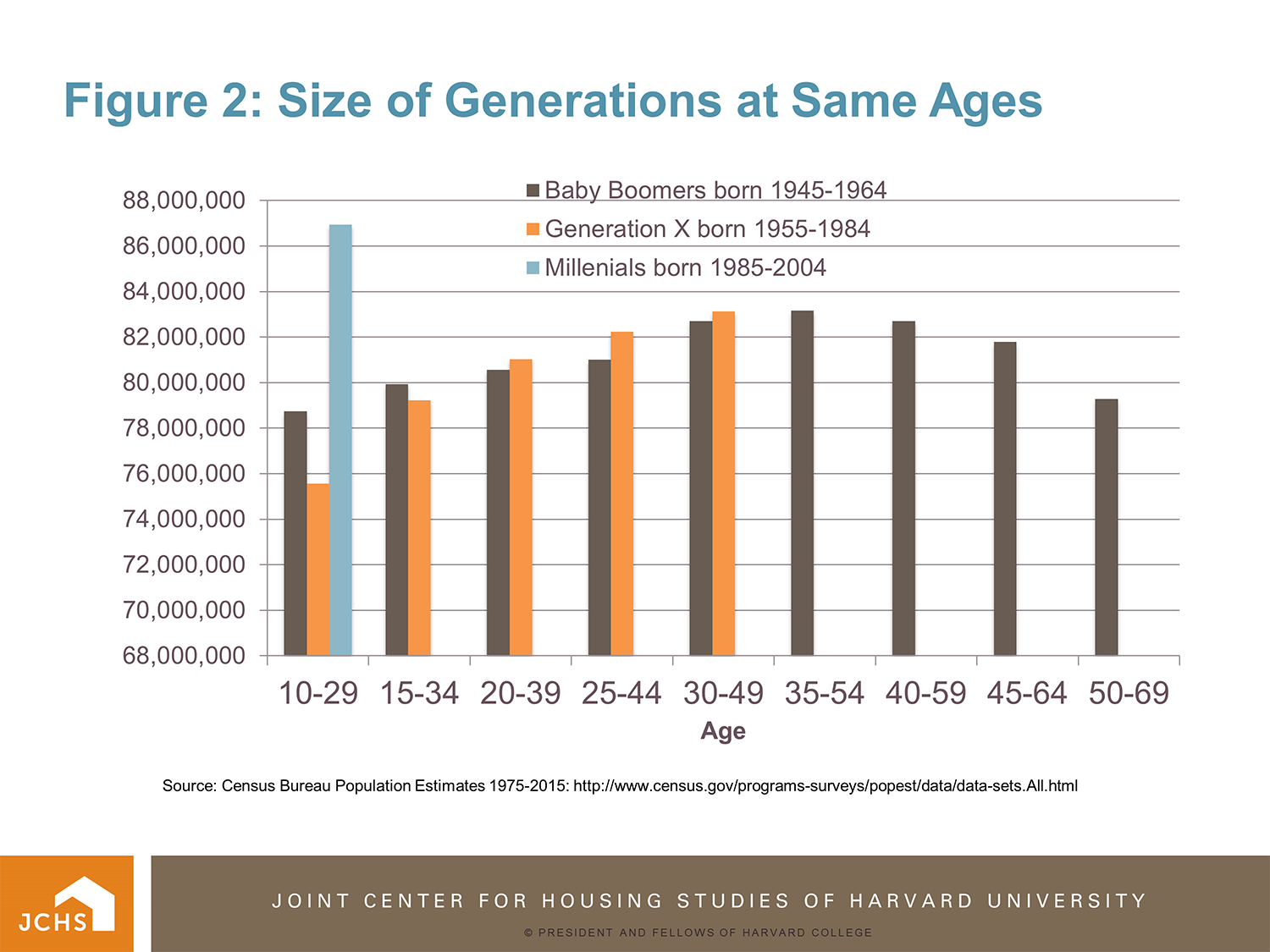 However, fewer overall births and smaller family sizes could impact housing consumption by making renting more likely or by reducing the demand for larger housing units. Moreover, fewer births will produce a smaller future labor force that may find it hard to support the very large generation of millennials when they reach retirement. If doing so requires higher taxes on young workers, then households may have less disposable income that might otherwise be used to pay for housing.