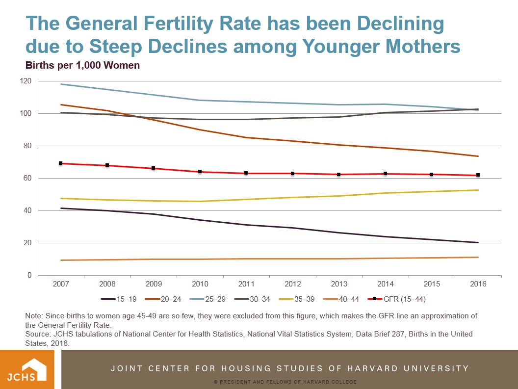 Source: JCHS tabulations of US Census Bureau, Current Population Surveys, National Center for Health Statistics, National Vital Statistics System, Data Brief 287, Births in the United States, 2016.